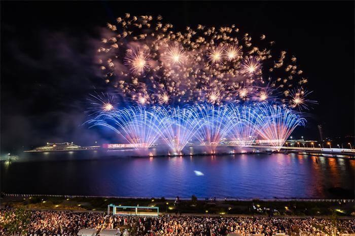 10月1日国庆节晚,“吴淞口空中剧场《大闹天宫》”也将升级回归,以科技手段将孙悟空腾云驾雾、天宫遨游的奇幻世界搬上天幕,延续这场古典美学与现代科技交融的夜空史诗,献礼祖国华诞。巧合的是当天爱达魔都号和皇家加勒比海洋光谱号两艘大型豪华邮轮停靠在吴淞口国际邮轮港,一万余名游客和船员将近距离观赏齐天大圣在宝山滨江闹“天宫”的精彩故事。