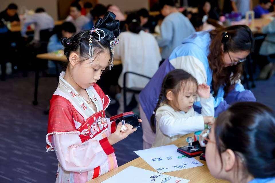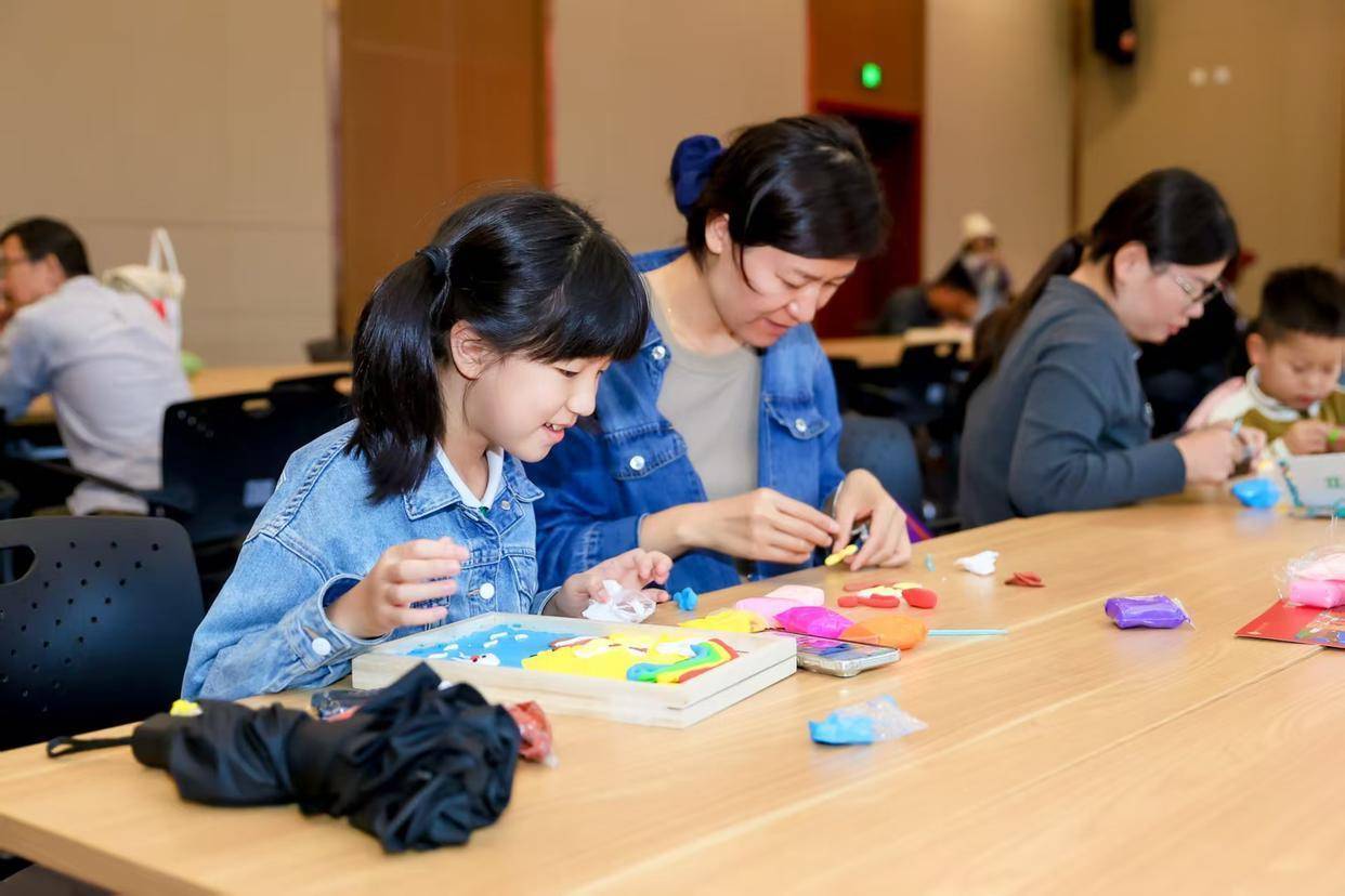 家住南阳路的退休教师曹女士郑重地在留言板上写下“月满华诞 家国同庆”八个大字:“在这个特别的日子里,能用笔尖传递对祖国的祝福,感觉特别有意义。”二楼报告厅内,粘土相框画活动同样人气爆棚。活动现场,9岁的小朋友波波在妈妈的帮助下,正用红色粘土仔细地制作国旗图案。“我们要把这个相框画放在家里最显眼的位置,”波波妈妈笑着说,“这是孩子献给祖国母亲最好的生日礼物。”